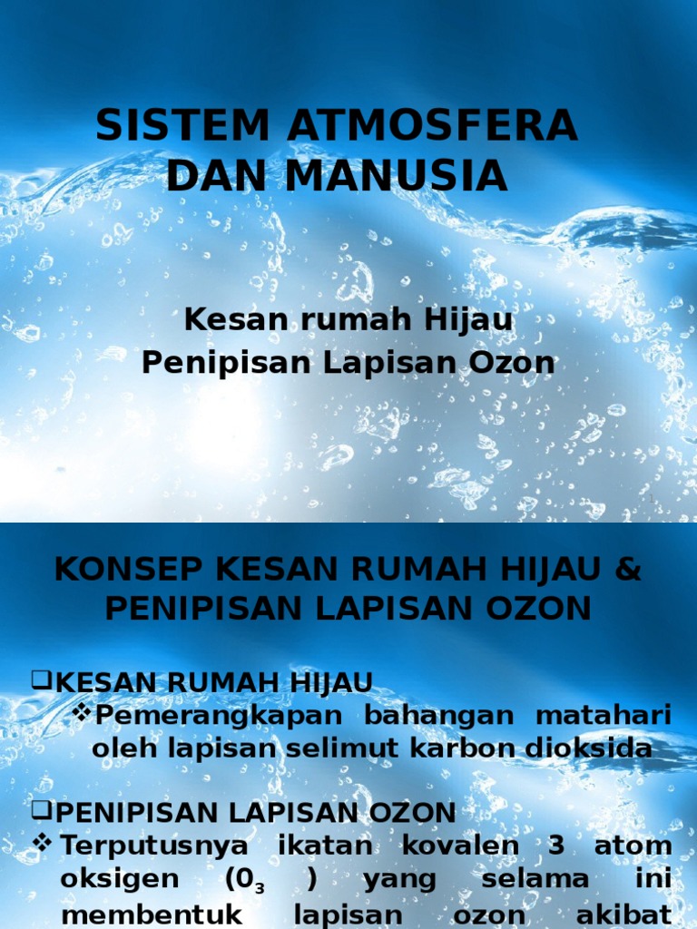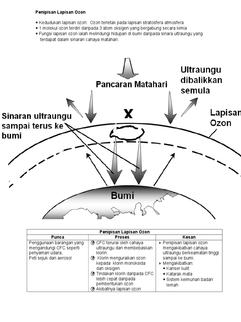 61 Kesan Rumah Hijau dan Penipisan 104 11 Maksud Atmosfera 1 Lapisan Ozon 114 12 Struktur Atmosfera 2 117 13 Kandungan Atmosfera 8 62 Pencemaran Udara dan Jerebu 124 14 Tenaga di Dalam Sistem Atmosfera. Kenaikan suhu bumi dan penipisan lapisan ozon menjadi punca kepada pemanasan global ini yang dapat dirasakan oleh seluruh penduduk bumi. Pembebasan gas CFC Kloroflourokarbon melalui penggunaan alat hawa dingin pewangi dan semburan cat juga menyebabkan berlakunya penipisan lapisan ozonAtom klorin yang terdapat dalam gas CFC memecahkan molekul oksigen yang membentuk lapisan ozon.